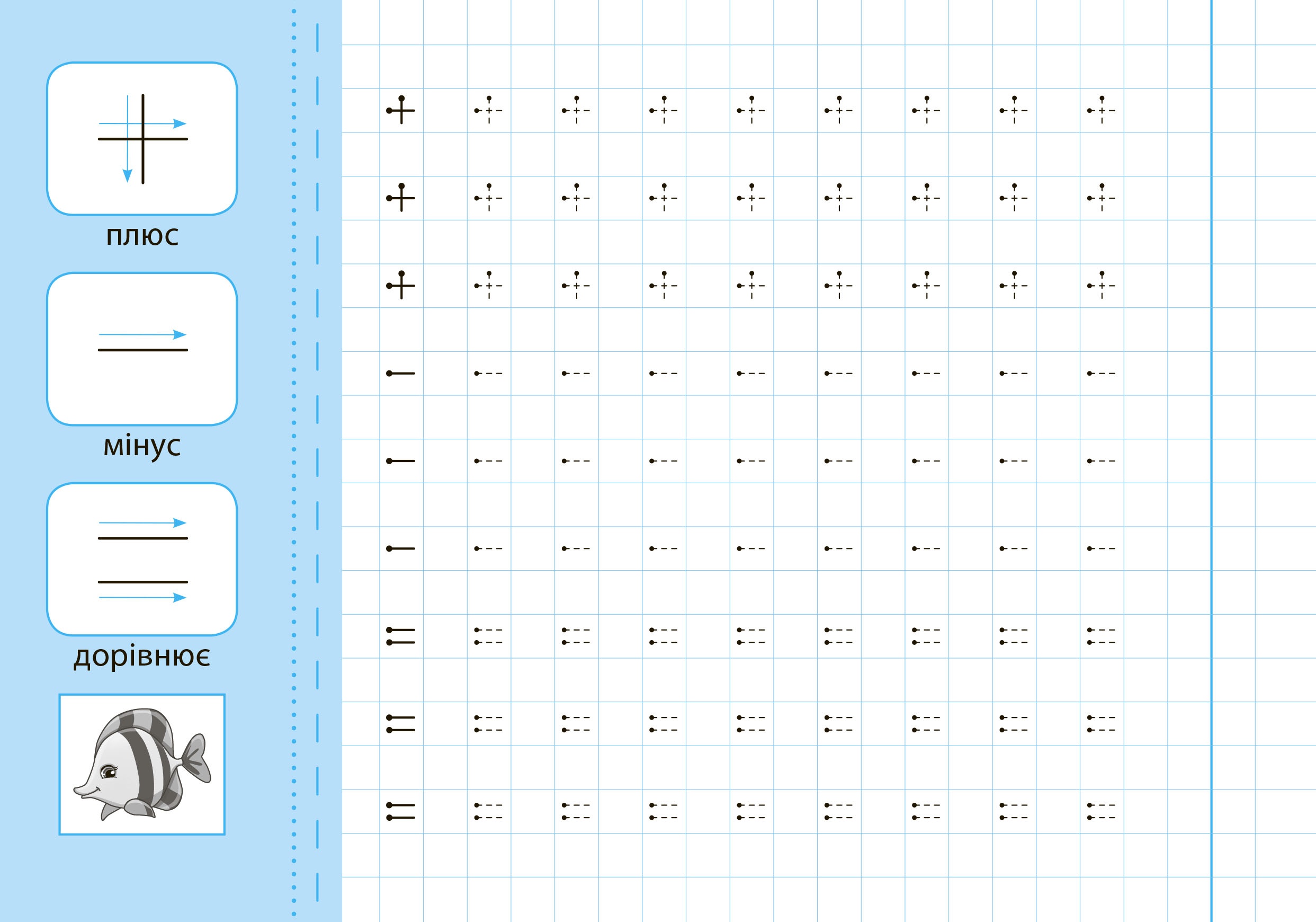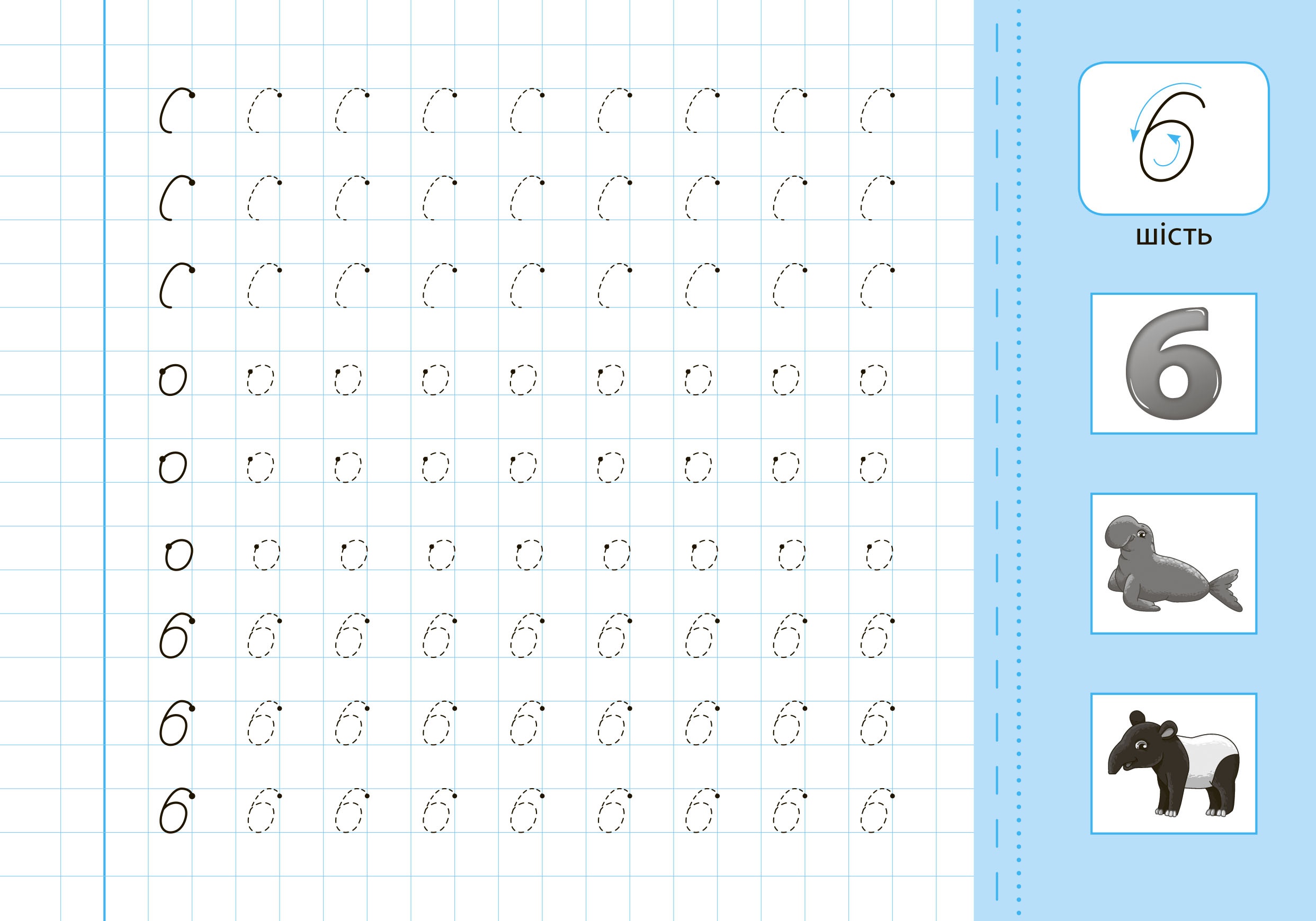 Із цією книжкою малюк швидко підготує руку до письма, малюючи різноманітні предмети по клітинках, навчиться писати цифри від окремих елементів до цілої цифри й арифметичні знаки по клітинках і точках. Систематичні заняття сприятимуть розвитку дрібної моторики, уваги та пам’яті, а кольорові наліпки урізноманітнять процес навчання й зроблять його ефективним і цікавим.