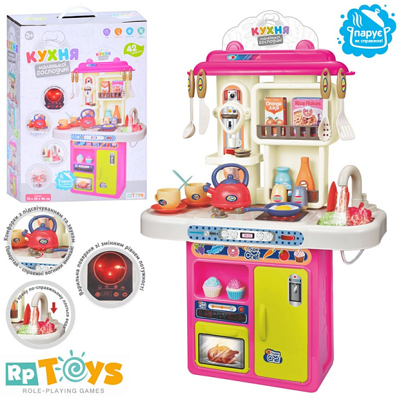 Опис Кухня 16890b 42 предм.,посуд,продукти,плита,мийка-ллється вода,пара,муз.,світло,бат.,кор.,47-35-14см