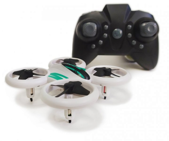 Маленький білий радіокерований квадрокоптер шириною всього 9 см. Літаючий пристрій має гарний багатофункціональний пульт управління:Посадка однією кнопкою.
