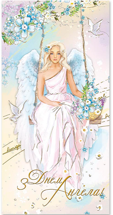 Опис Листівка подвійна Е з брокатом та тисненням з конвертом в упаковці Е-4385 "З Днем ангела!"