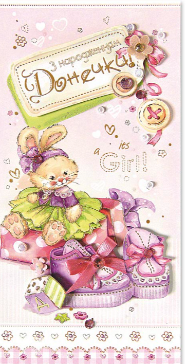 Опис Листівка ручної роботи Р з конвертом в упаковці Р-1232 (З нарожденням донечки!)