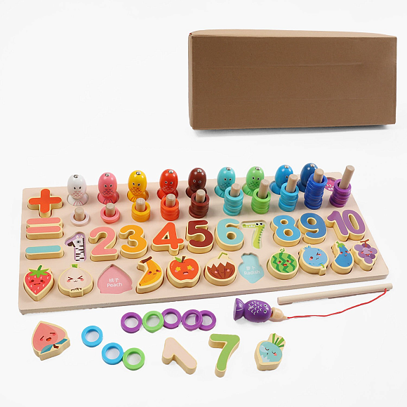 Опис Логічна дерев’яна дошка С 74472 (18) гра з кілочками, назви англ. мовою, магнітна риболовля, вкладиші, цифри, овочі, фрукти, кольорові кільця, сортер, в коробці