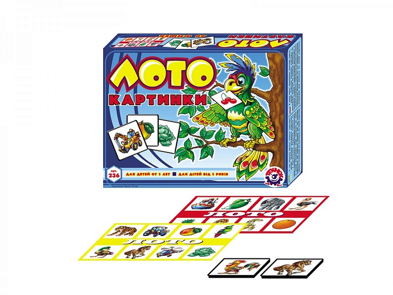 Лото з малюнками підготує Вашого малюка до школи і дозволить дитині поліпшити пам'ять, уяву, абстрактне і образне мислення, уважність і словниковий запас. Подаруйте своєму малюку справжні веселощі і гарний настрій!Крім того, в даній захоплюючій грі можуть брати участь до шести малюків. Всім гравцям роздають картки з малюнками. Ведучий по черзі виймає з коробки фішки з малюнками, після цього гравці з такими ж зображеннями закривають збіглися малюночки на своїх картках. Виграє той карапуз, хто першим накриє фішками всі зображення на своєму листочку.