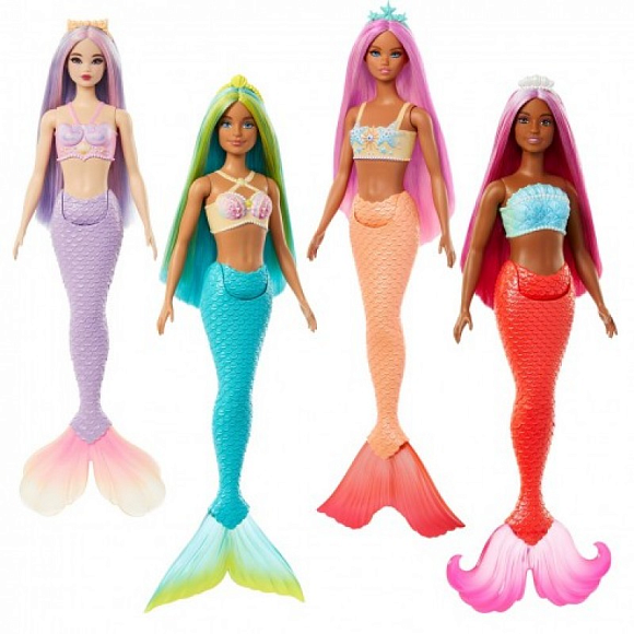 Чотири барвисті ляльки-русалки серії «Дрімтопія» від Barbie оживляють яскраві кольори веселки! На вибір пропонуються русалки блакитного, помаранчевого, персикового та ніжно-бузкового кольорів. Кожна лялька має ліф, оздоблений мушлями унікального дизайну, а також скульптурний хвіст тропічного кольору з плавниками омбре! Оригінальні обручі на голову, виконані в океанічному стилі, доповнюють яскраве, меліроване волосся. Діти можуть зібрати усю колекцію лялечок-русалок, щоб надихатися історіями дружби та уявляти фантастичні світи. Казкові ляльки Barbie стануть чарівним подарунком для дітей від 3 років! Ляльки не можуть стояти або плавати самостійно. Кольори й зовнішній вигляд можуть відрізнятися.