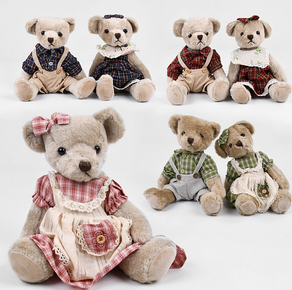 М'яка іграшка M 11086 неодмінно стане улюбленим та вірним другом для Вашої дитини. Ведмедики-хлопчики одягнені у світлі штанці й картату сорочку, а ведмедики-дівчатка виглядають дуже мило в вінтажному платтячку з бантиком на вушку. Іграшки виконані з м'якого штучного хутра з синтепоновим наповнювачем. Голова, ручки та ніжки прокручуються на 360°.