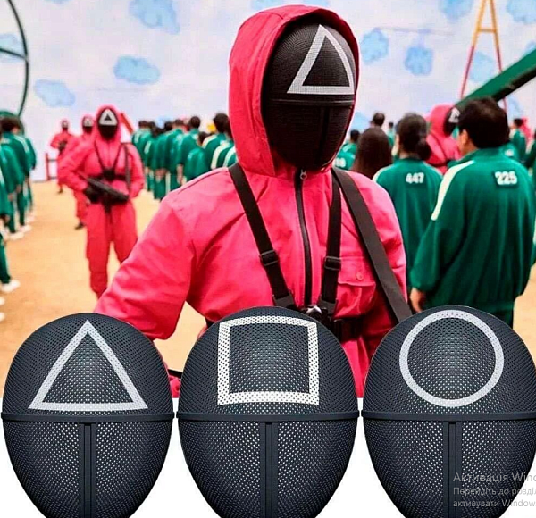 Маска наглядача 3939 з одного з найсерйозніших сереалів світу "Гра в кальмара" дозволить відчути себе героєм пригодницького трилера! У серіалі маски носили лише наглядачі та розпорядник. Кожен персонаж у червоних костюмах має фігуру в області чола, якій відповідають обов'язки. Маска “Коло” була надіта на людей, які займаються господарськими справами – готуванням, прибиранням, обслуговуванням атракціонів та нових випробувань. "Квадрати" спостерігають за іншими робітниками та гравцями. "Трикутники" є охоронцями та озброєні.Маска виконана із пластику, пофарбована в чорний матовий та імітує форму овалу.