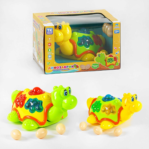 Опис Музичний динозаврик TK 50633 (48/2) "TK Group", 2 кольори, ОЗВУЧУВАННЯ УКРАЇНСЬКОЮ МОВОЮ, світло, колесо вільного руху, пісня, яйця, в коробці
