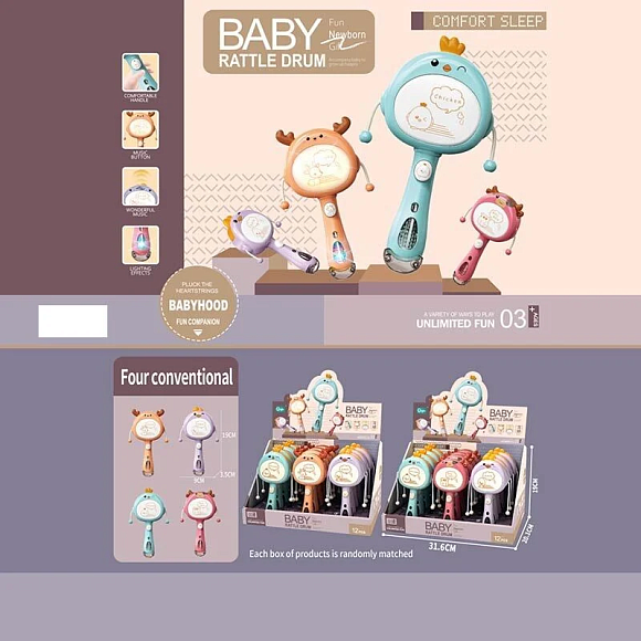Опис Набір брязкалець HY 629 (16/2) ЦІНА ЗА 1 ШТУКУ, В БЛОЦІ 12 ШТУК, пісенька, підсвічування, колотушка, в коробці