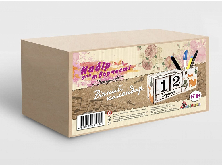 Розмір коробки ДхШхВ см -10,5х9,3х21. Розмір готового виробу ДхШхВ: 17х5,5х7,5см.У наборі: заготівля з МДФ, декупажна серветка, клей ПВА, акрилові фарби, кисть д / декупажу, спонж, цифри і місяці для календаря. Для дітей від 8 років.