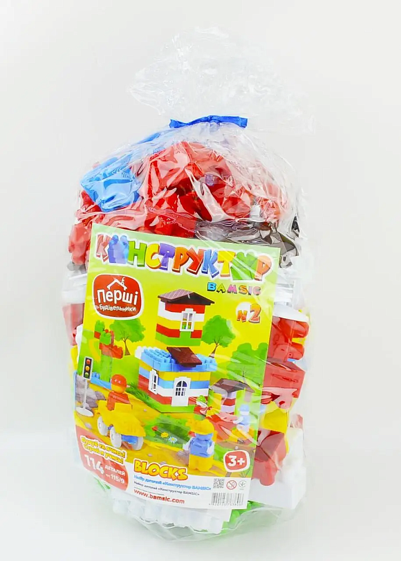 Конструктор BAMSBLOCK No2 114 деталей. Цей конструктор виготовлений із нетоксичного пластику та всі його деталі надійні та безпечні. Конструктор міцний, легкий, має яскраві деталі, дуже простий в експлуатації та розрахований на тривале використання. Завдяки іграм із конструктором дитина розвиває не тільки моторику рук, а й розумове мислення.Розмір упаковки: 28*20 см