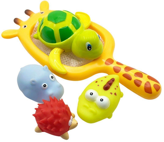 Набір для купання з сачком "Жираф та тваринки", 5 елементів. До набору входить: сітка-сачок у формі жирафа розміром 25*11 см, 3 тваринки невеличкого розміру та одна заводна механічна черепашка розміром 11,7*3,5*3,5 см (дуже простий механічний, принцип роботи: потрібно лише завести за допомогою спеціального важеля і запустити у воду). Виготовлені з якісного і безпечного РР та ПВХ-матеріалу, не мають різкого стороннього запаху. Розвивають дрібну моторику що позитивно позначається на розвитку мови, логічне мислення, сприйняття кольорів, координацію рухів.Сітчата упаковка. TM BIBI TOYS