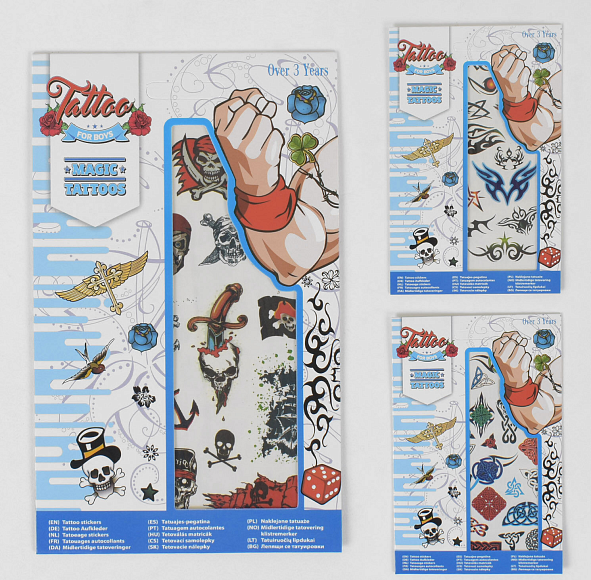 Коли приходить літо, кожна дитина хоче прикрасить своє тіло яскравими і стильними малюнками, які так легко знімаються з шкіри.Татуювання 8208 представлені для хлопчиків в 3х видах: