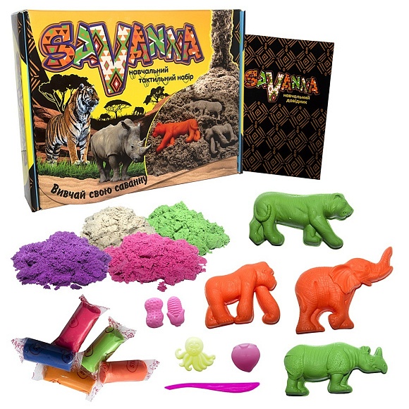Можливість створити привабливі простори савани з різними кумедними мешканцями дасть можливість дитині набір Savanna. Організувати різні ландшафти можна за допомогою кінетичного піску - дивного матеріалу. Пластична маса, що складається з натурального піску, пов'язаного в одну масу полімером, дозволяє виліпити будь-яку ігрову фантазію і нагадує вологий пісок на пляжі. Ні дощ, ні вітер не зруйнують пісочний будівлі і скульптури, які створить маленький фантазер! Фігурки різних звіряток, які можна виготовити з маси для ліплення допоможуть створити різноманітні формочки за допомогою скульптурного стека - яскрава інструкція допоможе виліпити забавні фігурки. Після того як виріб готовий, маса застигає, перетворюючись на легке, але міцну іграшку яскравих кольорів. Дитина може придумати будь-яку фігурку або композицію - необхідна всього лише фантазія! В процесі гри дитина буде м'яти, формувати, стискати і розтягувати піщану масу, розвиваючи крім фантазії моторику і рухові навички. Кінетичний пісок - це художня гра, творчість і навчання одночасно. Склад - 98% кварцового піску та 2% спеціального сполучного агента. Ця речовина робить пісок на дотик вологим і не дає йому розсипатися навіть через довгий час. Пісок не висихає, частинки не прилипають до тіла, може приймати будь-яку форму, антибактеріальний. Маса для ліплення дуже пластична, різні кольори легко змішуються, вона не забруднює руки і може приймати будь-яку форму. Має яскраві кольори і абсолютно безпечна. У комплекті є контейнер для зберігання маси. Склад маси: вода, наповнювач, барвник. Форми виконані з пластика. Упакований набір в яскраву кольорову коробку і буде відмінним подарунком для малюка.Вік: 5 +