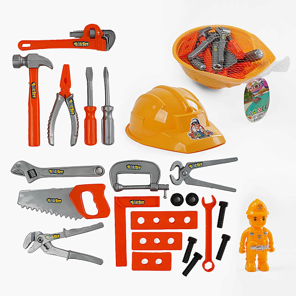 Набір інструментів 1399-15 (120/2) каска, фігурка ремонтувальника, викрутка, гайковий ключ, плоскогубці, молоток, пила, лінійка, в сітці
