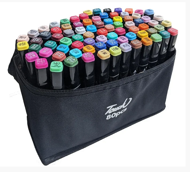 Набір двосторонніх фломастерів / скетч маркерів на спиртовій основі. У наборі 80 штук в пластиковому футлярі. З одного боку звичайний фломастер, з іншого боку скошений маркер. Кожен колір має свій цифровий код, який нанесений на ковпачок маркера. Колпочкі щільно закривають маркер, перешкоджаючи висиханню. Чорнило на спиртовій основі добре вбираються в папір, тому рекомендується використовувати щільні листи або картон