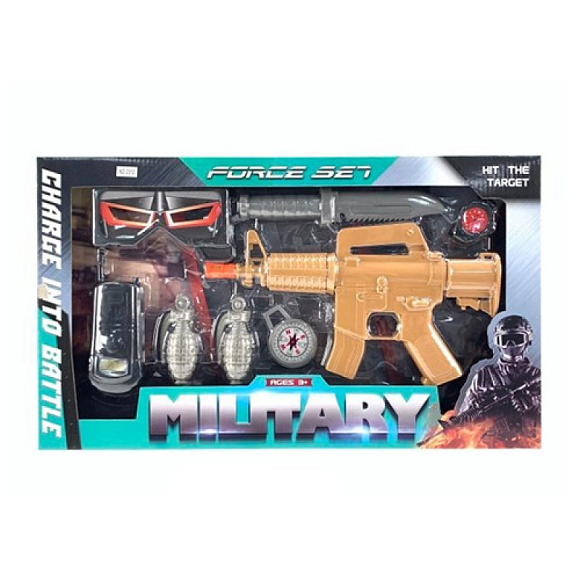 Опис Набір зі зброєю 2312 трещітка, автомат, ніж, рація, окуляри, годинник, кор., 50-29-3,5 см.