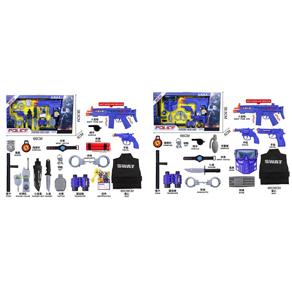 Опис Набір зі зброєю JC002-04A поліція, жилет,пістолет 2шт.,рація,компас,ніж,бінокль,2види,кор.,67-39-5см