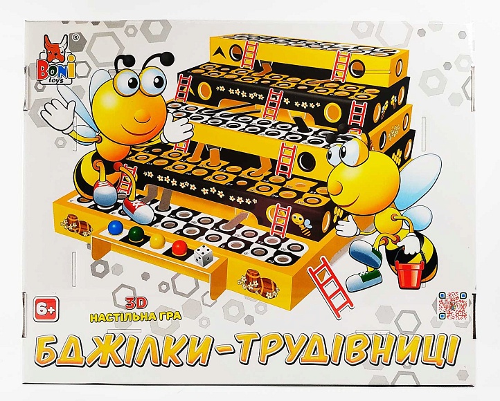 Настільна 3D гра «Бджілки-трудівниці» - це цікава гра з орігінальною конструкцією. На початку гри кожному учаснику надається фішка (кулька). Гравці кидають кубик по черзі і просувають свою фішку вперед по ігровому полю на стільки позицій, скільки очок випало на кубику. Якщо в кінці ходу фішка (кулька) зупинилася на полі з драбинкою, то гравець переставляє її на поле наступного рівня, куди веде драбинка. Учасники пересувають по ігровому полю свої фішки, намагаючися найшвидший пройти всі поля, адже на шляху гравців чекає багато небезпек. Якщо в кінці ходу фішка (кулька) провалюється, фішка гравця опиняється на нижчому рівні, віддаляючиcь таким чином від перемоги.
