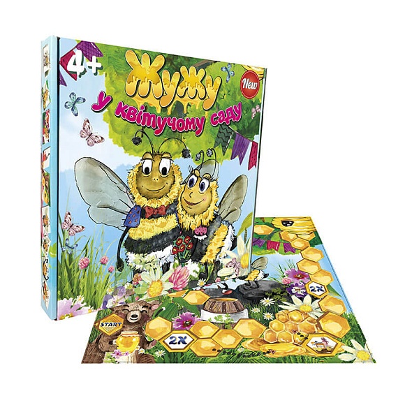 Розважальна барвиста гра «Жу-Жу в квітучому саду» розрахована на 2-4 гравця. Суть гри - пересуватися по осередках стільників, виконуючи завдання. Гравці (бджілки) парять по саду, виконуючи завдання: печуть млинці, прикрашають сад, готують стіл до чаювання. Учасники по черзі тягнуть картки, виконуючи завдання відповідно до інструкції, і наближаються до кінцевої точки - каменю, де можна поласувати смачними млинцями. У наборі також фарби та пензлик, діти на зворотному боці поля можуть прикрасити симпатичну картинку.