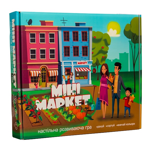 «Міні маркет» - розвиваюча гра для дітей, яка забезпечить легке вивчення квітів, овочів та фруктів, а також поліпшить навички рахунку. Пінопластові овочі та фрукти продемонструють різні форми, види і кольору. Внутрішня частина коробки імітує справжній прилавок, тому ви зможете: сортувати овочі і фрукти за кольором, розрізняти за формою, порівнювати кількість або визначати за картками, де вони ростуть (в землі або на дереві). Комбінуйте картки з цифрами і квітами для створення різних завдань. Просіть дитини пояснювати кожну свою дію і одночасно розвивайте увагу, дрібну моторику і основи математики.вік 3+