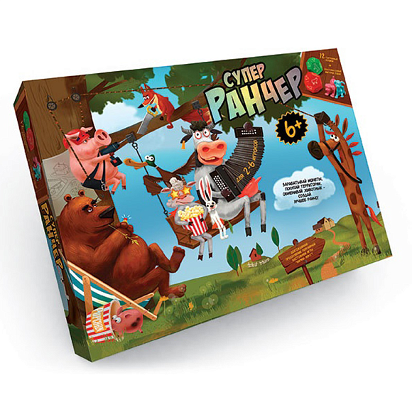 Настільна гра "Супер Ранчер". Продовження популярної гри "Ферма Люкс", Вам доведеться заробляти монети, купувати території та провити стратегічне мислення.Для перемоги потрібно зібрати хоча б по одному виду всіх тварин.