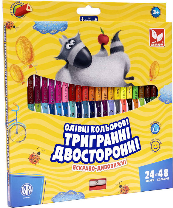 Опис Олівці кольорові тригранні двосторонні + чинка - 48 кольорів (24 шт.)
