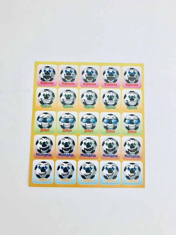Малюки в садку і початковій школі не отримують повноцінних оцінок, а так хочеться похвалитися власними досягненнями у навчанні перед друзями і батьками. Тому вчителі можуть мотивувати і підбадьорювати своїх вихованців і учнів такими чудовими наклейками-оцінками. 25 наклейок з малюнками кубків позначають оцінки відмінно, відмінно, добре, молодець і красиво. Дітям буде цікаво дивувати наставників своїми знаннями і колекціонувати такі позитивні наклейки.