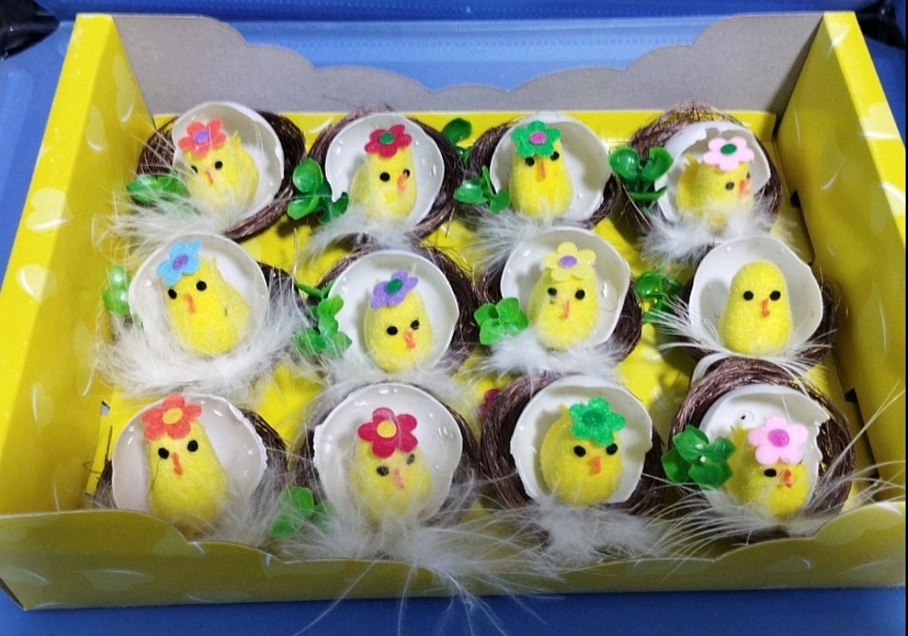 У гнізді сидить курча. Такий декор допоможе завершити вам великоднє декорування. Габарити сувеніра 5,0*5,0 см. На фото показані види сувенірів в упаковці.