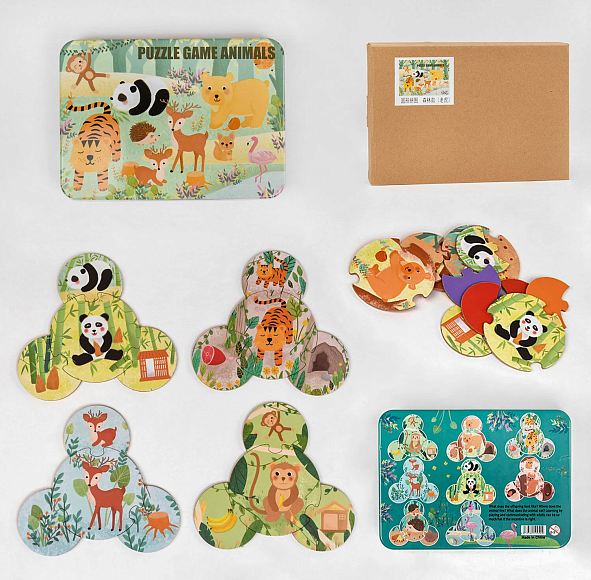 У комплектацію входить 8 пар логічних пазлів, на кожному з яких зображено веселе звірятко та характерне для нього місце існування.