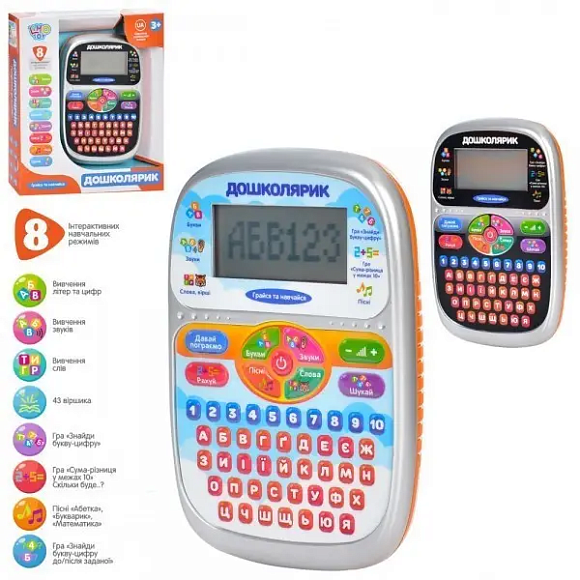 Опис Планшет SK 0023 AB навч., цифри, пісні, вірші, 2 кольори, муз. (УКР.), бат., кор., 19,5-22-4,5 см.