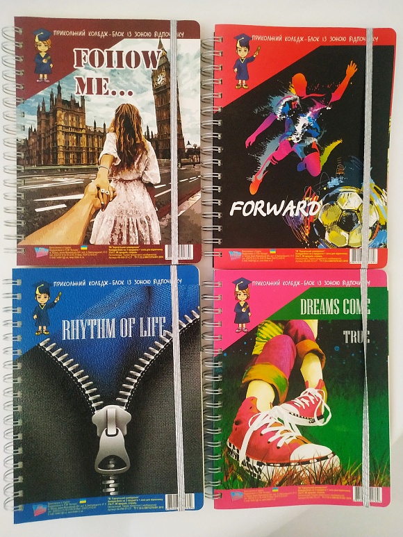 Зошит на спіралі стане в нагоді, як школярам і студентам, так і офісним працівникам і керівникам для обліку і записів. Зошит на спіралі з роздільниками або кольоровими регістрами буде зручна для декількох предметів або декількох видів діяльності одночасно.Від звичайного блокнота коледж-блок відрізняється, перш за все, функціональністю. Деякі види блокнотів даного виду містять корисну інформацію у вигляді позначень штрих-кодів, всіляких таблиць, адрес сайтів і т.д.
