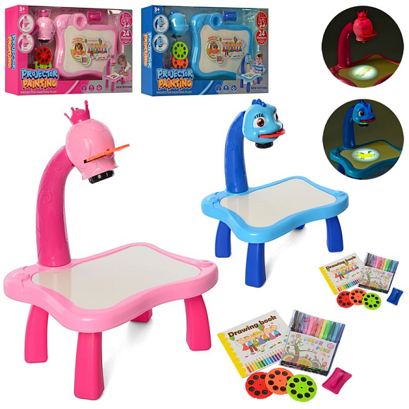 Опис Проектор YM6446-6556 слайди (24 картинки), фломастери 12 шт., 2 види,муз.,світло,бат.,кор.,46-28-9см