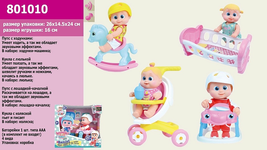 Опис Пупс функц 801001 (8шт) 4 вида,пьет-пис, ползает,говорит, бат.,пупс 16 см, в коробке 24*12,5*23 см