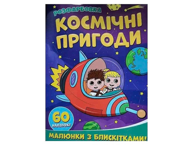 Опис Розфарбовка А4 з блискітками+60наліп. Космічні пригоди