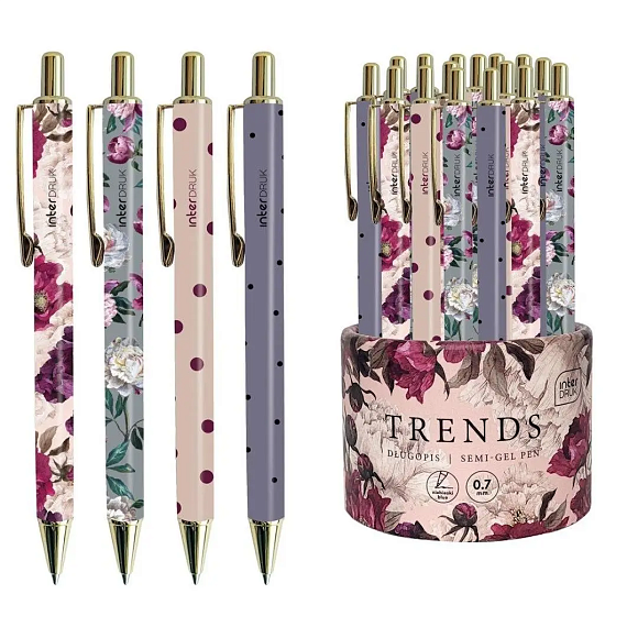 Ручка кулькова з чорнилом на масляній основі металева від польского виробника ТМ Іnterdruk . Автоматичний механізм подачі стрижня. Має красивий сучасний дизайн з додаванням золотистих деталей.Колір чорнил - синій, товщині лінії письма 0,7 мм. Знаходиться в зручній картонній тубі круглої форми в кількості 16 шт - 4 дизайни по 4шт.