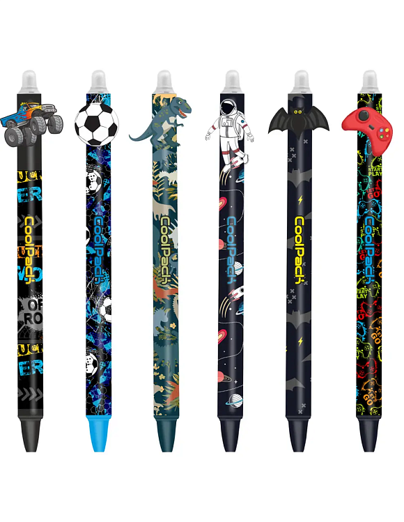 Ручка автоматична пиши - стирай ТМ СoolPack "Boys MIX" у 6 дизайнах, 36 штук в картонному дисплеї.Ручка має силіконовий накінечник, який виконує функцію гумки.З цією ручкою можна легко та швидко усунути помилки.Унікальні швидковисихаючі чорнила насиченого синього кольору.Змінний стрижень. Не токсичні.