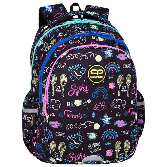 Рюкзак JERRY 15 TENNIS STAR. Об'єм - 21 літр, розмір - 39х28х15 см. Рюкзак 3 відділення на двосторонній блискавці. Кишеня з органайзером,брелком для ключів, та відділом для дрібниць . Бокові кишені для зберігання пляшечки. Спеціальні ремені на грудях для комфортного розподілу ваги. Зручна ручка.Контурна спинка та лямки з сіткою для вентилювання. Посилене дно. Світловідбиваючі смуги. Матеріал - водонепроникний поліестер 600 d.