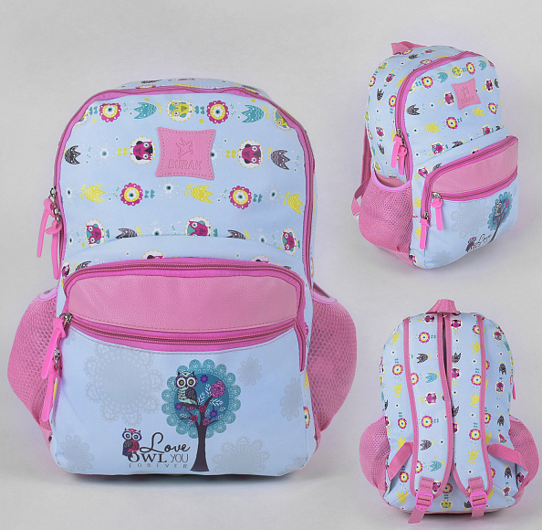 Легкий і дуже місткий шкільний портфель З 43515 виконаний у привабливій стилістиці, яка ідеально підійде дівчаткам.Портфель із зовнішнього боку обшитий полімерних матеріалів, він дуже приємний і гладкий на дотик, а також з легкістю відштовхує воду. Дизайн поєднує в собі світло блакитний і рожевий колір. Особовий кишеню прикрашений яскравим прийнятий з деревом і совою. По всьому портфелю розташувалися невеликі малюнки із зображенням квітів і совенят.