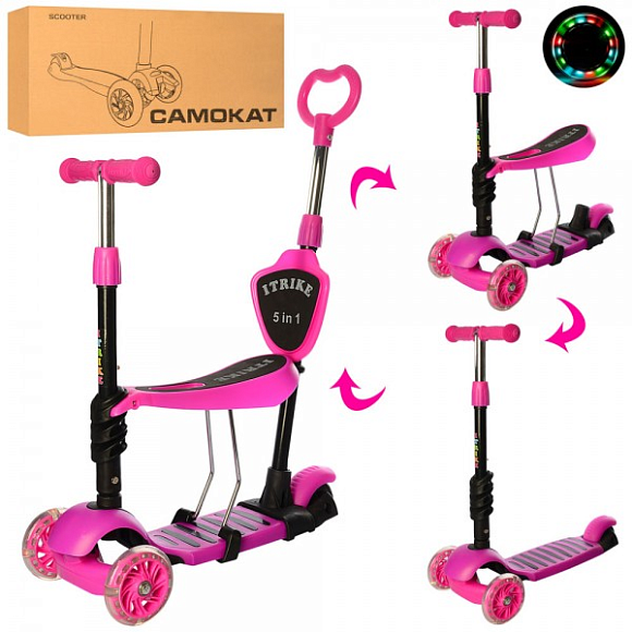 Самокат iTrike JR 3-026-P: рожевий, 5 в 1, біговел, батьківська ручка, кошик, на колесах, що світяться, для дітей від 1,5 року.