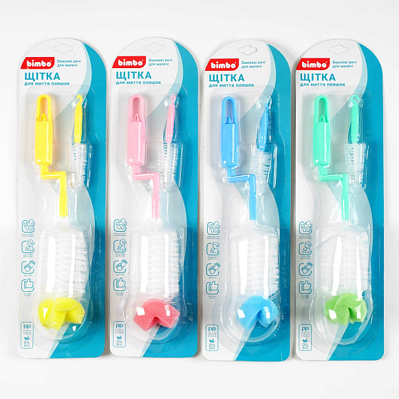 Опис Щітка для миття пляшечок C 63888 (144) "Bimbo", 4 види, додаткова щітка, з поролоном, на листі, ВИДАЄТЬСЯ ТІЛЬКИ МІКС ВИДІВ