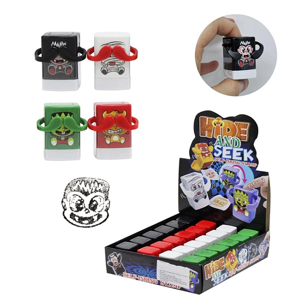 Штампи дитячі "Монстри" . В дисплеї 24 шт. 4 види штампів. При натисканні рухаються ручки та висувається штамп.Розмір виробу 36*28*42мм, діаметр штампа 18,5*18,5 мм. Розмір дисплея 162*197*44 мм.