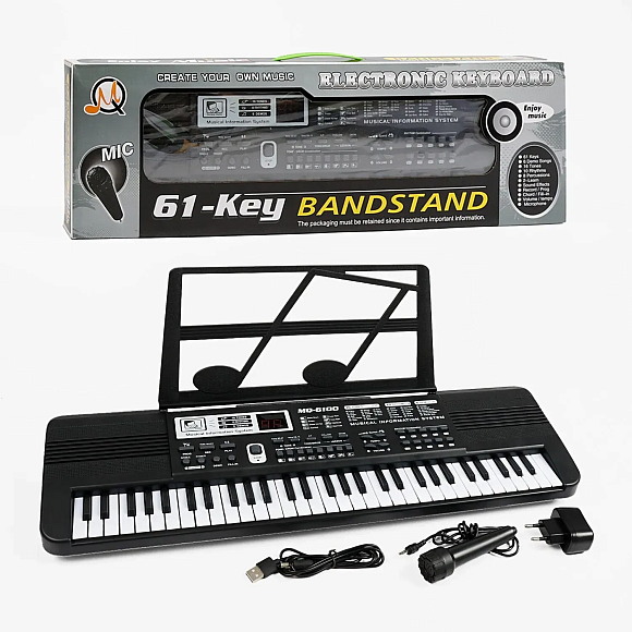 Опис Синтезатор MQ 6100, 61 клавіша, мікрофон, регулювання гучності, дисплей, мелодії, запис та відтворення звуків, працює від мережі та батарейок, USB-каб