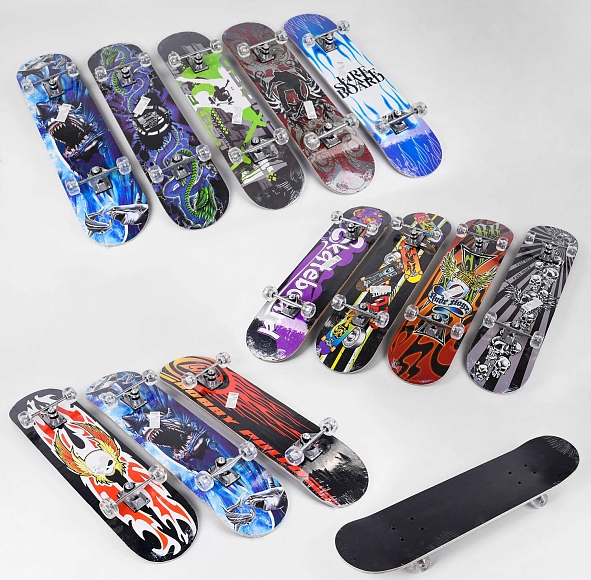 Скейтборд - вид транспортного засобу, який став одним із способів розваг і проведення дозвілля. Для дітей скейт - це активна гра, фізичний розвиток і веселе проведення часу.Даний скейт складається з деки і підвіски. Дека скейта виконана з декількох шарів. Кожен з 6-ти представлених скейтборів оформлений оригінальними малюнками на будь-який смак.