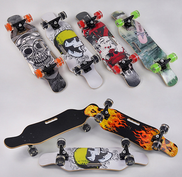 Опис Скейт С 32024 (6) 6 видів, колеса світяться pu d = 6см, 6 шарів канадського клена, підшипники abec-9, дека з ручкою