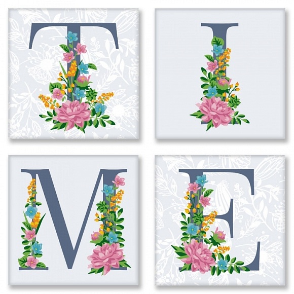 -4 полотна з кольоровим фоном на підрамниках 18 * 18. На кожному полотні розміщені контури букви в квітковому оформленні з номерами під розмальовку.