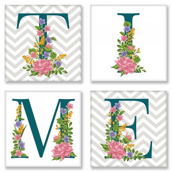 -4 полотна з кольоровим фоном на підрамниках 18 * 18. На кожному полотні розміщені контури букви в квітковому оформленні з номерами під розмальовку.