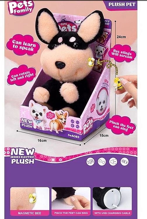 Інтерактивний собака з кумедною мордочкою знає, як розважити дитину. Він вміє співати, рухатись та повторювати різні фрази. Все, що потрібно, щоб активувати пухнастого малюка - натиснути на задню лапку (саме там розташована кнопка активації та перемикання режимів). На щоці собаки сидить магнітна бджілка: якщо забрати комашку, то песик почне жалібно скиглити - бджілка вкусила його. Саме тому мордочка собаки трохи роздуло. Особливості: