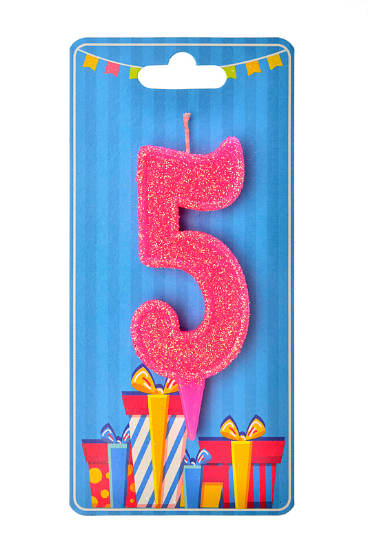 Свічка у формі цифри "5" відмінно підійде для декорування торта або інших десертівСвічку вироблено з якісного парафіну у формі цифри рожевого кольору, посипана зверху рожевим глітером середньої фракції