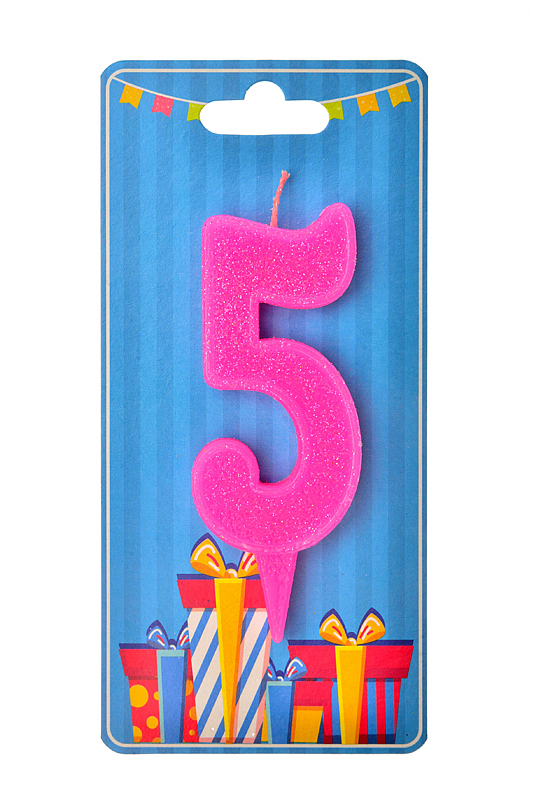 Свічка у формі цифри "5" відмінно підійде для декорування торта або інших десертівСвічку вироблено з якісного парафіну у формі цифри рожевого кольору, посипана зверху райдужним глітером середньої фракції