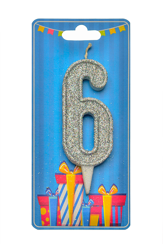 Свічка у формі цифри "6" відмінно підійде для декорування торта або інших десертівСвічку вироблено з якісного парафіну у формі цифри білого кольору, посипана зверху срібним глітером середньої фракції